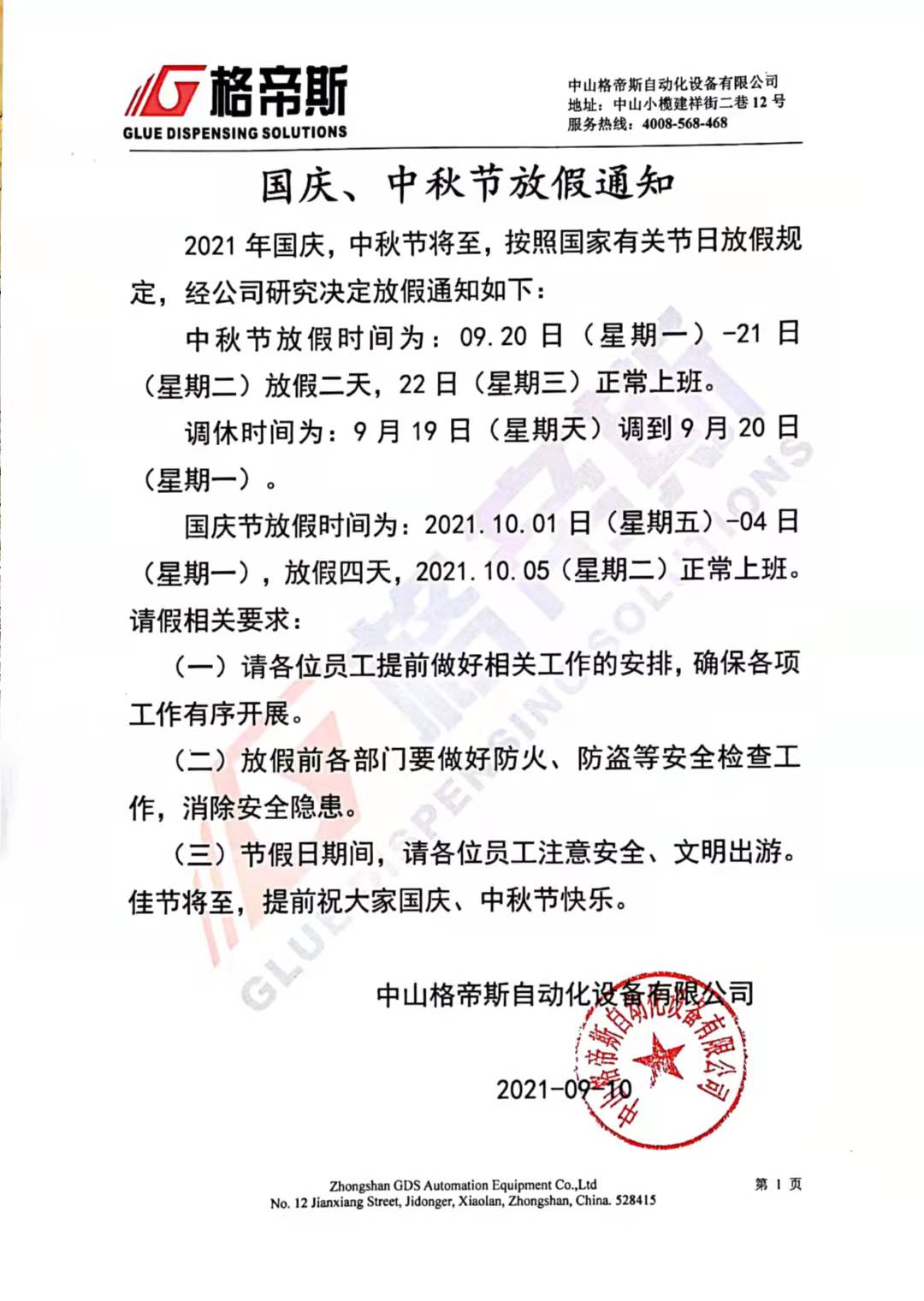 中山格帝斯自动化设备关于中秋节、国庆节放假通知安排如下