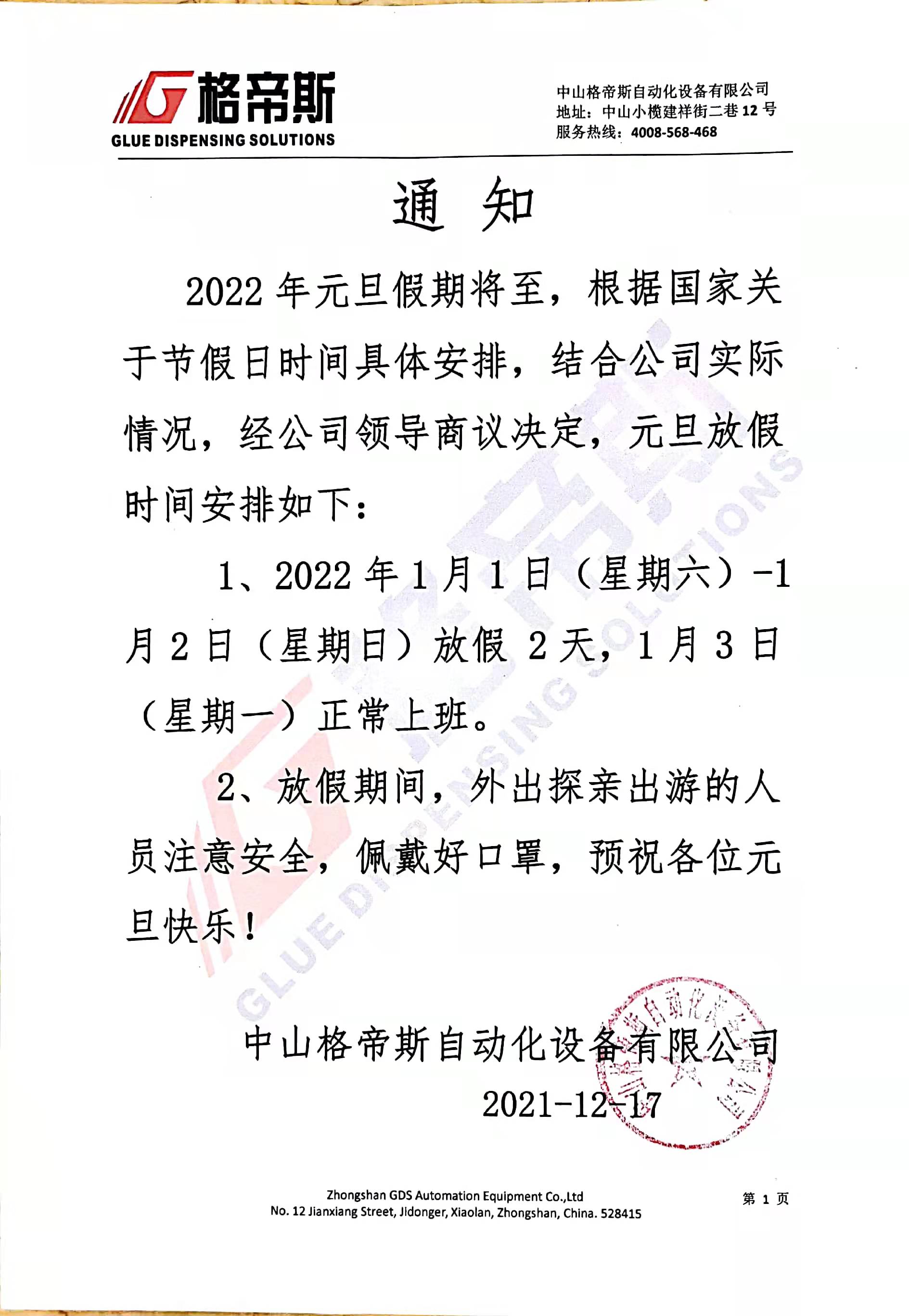 格帝斯关于2022年元旦节放假时间安排